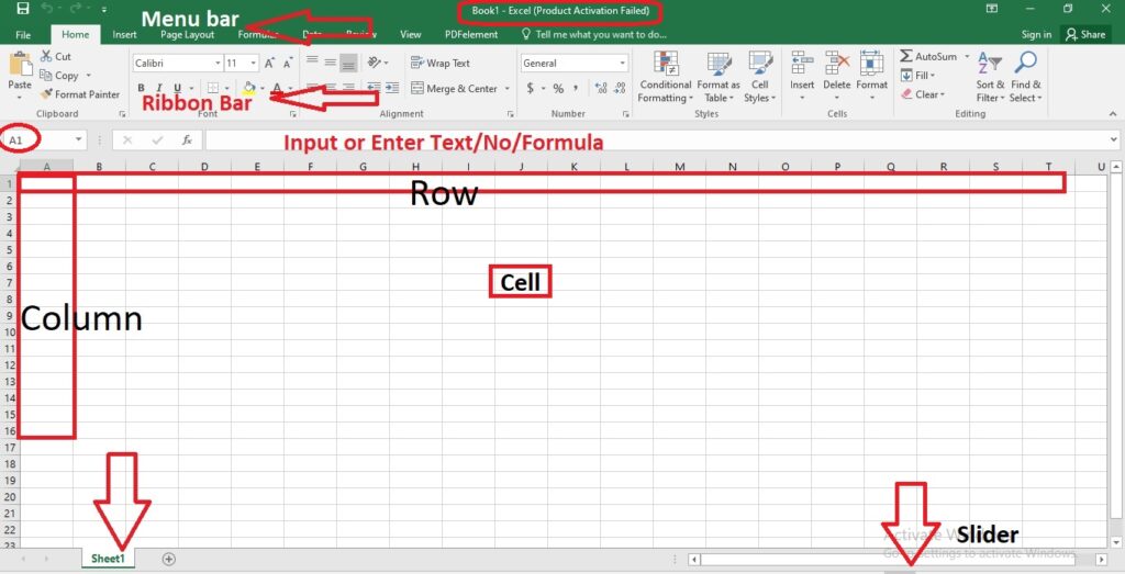 नीचे आप स्क्रीन शॉट मे MS Excel विंडो के एलिमेंट्स को देख सकते है। जब आप प्रथम बार Excel को ओपन करते है तो आपके सामने इसी तरह का इंटरफेस आता है। डिफ़ॉल्ट रूप मे एक ही Sheet ओपन रहता है जिसका नाम Sheet 1 होता है। आप और भी Sheet को ऐड कर सकते है।
