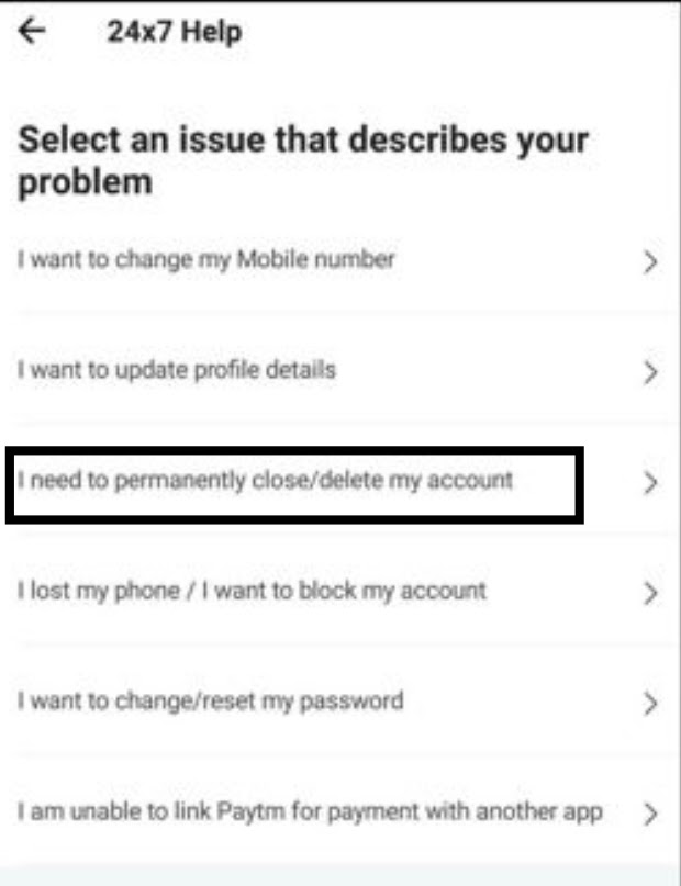 Step 7) अब आपको अपना Issue Select करना है की आपको क्या Issue है। चूंकि आप को Paytm Account को बंद करना है तो आपको ‘I Need To Permanently Close/Delete My Account’ पर क्लिक कर देना है।